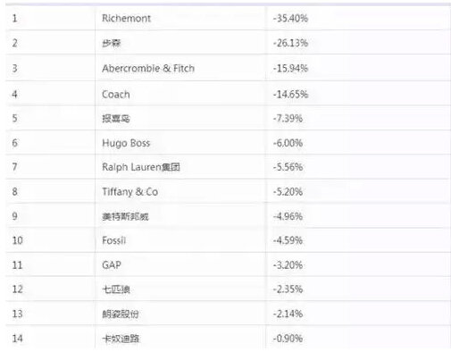 下表是业绩出现下跌的27个上市品牌公司,其中有12个品牌有两位数的跌幅: