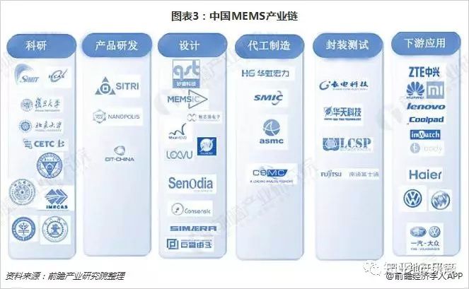 b.中国mems传感器产业链趋于完整,主要分布在长三角、珠三角地区。在中国mems产业链中,科研环节上,我们有包括清华北大等众多高校以及科研机构;产品研发则主要包括括上海微技术工业研究院、苏州纳米城、无锡物联网等单位;设计环节有memsic、硅睿科技、敏芯微电子等;代工制造包括中芯国际、华虹宏力、csmc、asmc、耐威科技;封装测试包括长电科技、华天科技、通富微电、晶方科技等;下游应用包括智能手机、平板电脑、汽车、工业等领域。