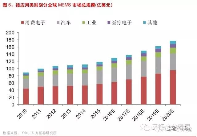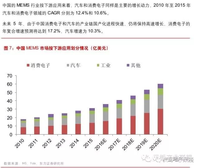 mems 下游主要为汽车和消费电子:1)在2010 年至2015 年期间,汽车领域mems 市场的cagr 为6.8%,高于消费电子的5.1%增速。2)未来下游应用领域中快速增长的是消费电子,2015 年至2020 年cagr 为10.9%。3)随着产品的不断成熟,航空航天、医学和工业的应用也逐渐普及。