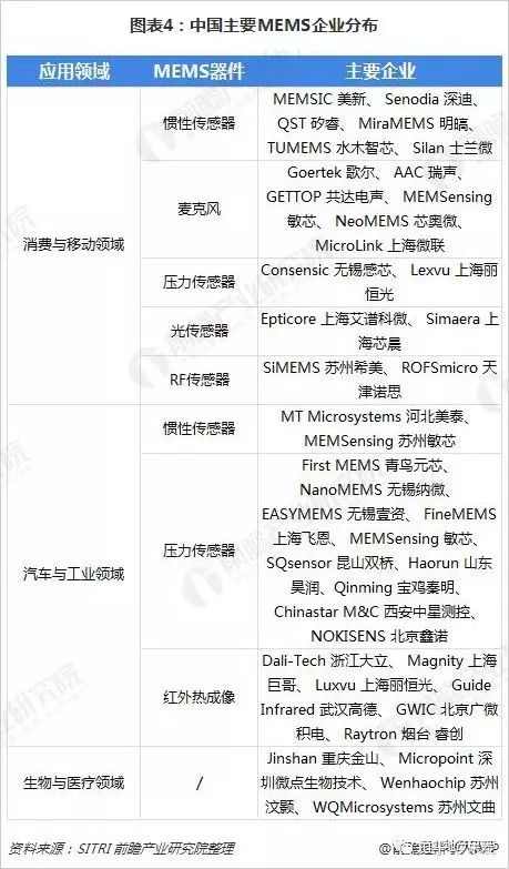 c.应用领域上,主要有消费移动领域、汽车与工业领域和生物与医疗领域等。其中,我国mems企业主要分布在消费与移动领域和汽车与工业领域;主要产品包括压力传感器、麦克风、红外热成像等。