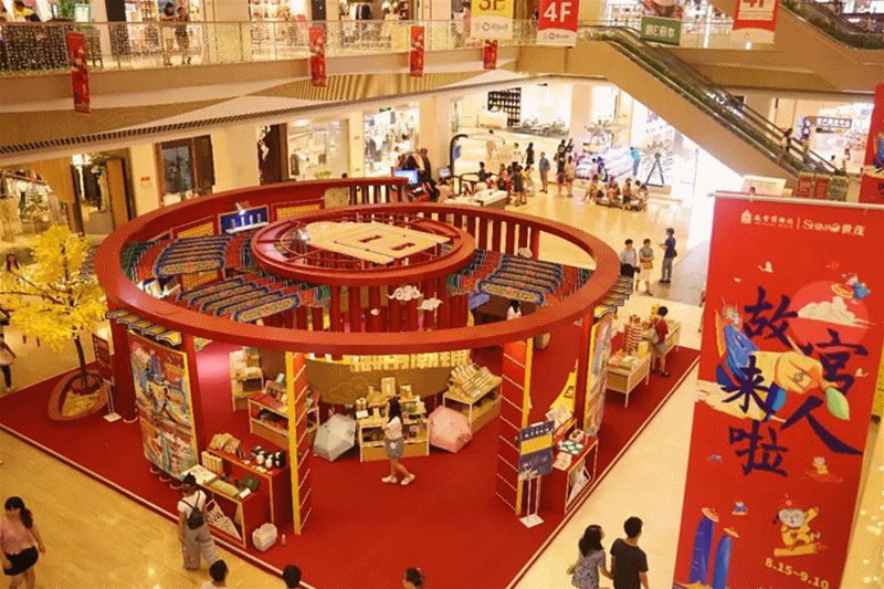 2019年“潮玩过大年”主题活动中,上海世茂广场将传统文化引入中国传统的重要节日——春节,在设计风格上,整个故宫快闪店采用朱红、明黄、石青等皇家传统颜色,祥云、故宫房梁花纹等元素借鉴了紫禁城的建筑艺术风格。