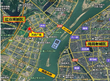 红谷滩新区是南昌市规划打造的cbd,与老城区一江相隔,通过八一大桥、南昌大桥和英雄大桥相连,新区2012年已有60万左右人口,拥有目前亚洲最大音乐喷泉群的秋水广场也吸引了昌北和经开区的大量人气。万达广场坐落于红谷滩新区中心区凤凰中大道与会展路交汇处,考虑项目的支撑人口数量的时候必须考虑人口分布特点。尽管新区与老城区最短距离仅1公里,但赣江对两岸商业将会形成巨大的阻隔作用,影响两区商业商圈的辐射范围。万达广场的支撑人口应该只有红谷滩新区规划人口及赣江以北附近的几个片区。