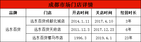 近十年来,受电商冲击、购物中心遍地开花及新消费方式出现等影响,传统百货物业老旧、模式标准单一、体验不佳等问题进一步暴露,行业整体发展受阻。在巨大的冲击下,虽然百货极力寻求突破转型,却未见成效,自2015年起成都百货关店潮频现。远东百货成都北城店、远东百货天府店分别于2017年4月10日、2017年12月23日正式停业,而其在成都的最后一家店,也于2019年4月1日正式关闭。