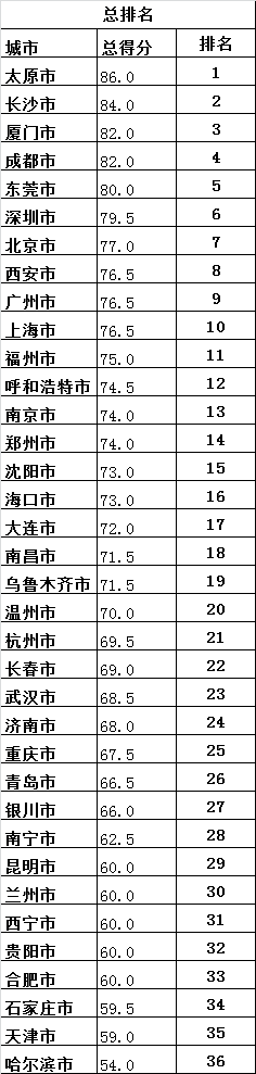 本次调查的城市共计36个,涵盖中国大陆除拉萨市以外的30个省会城市、直辖市,4个计划单列市和两个其他城市。指数的核心数据为连锁品牌化的便利店数量、便利店数量的增速、24小时便利店的比例及政策支持力度;在此基础上,统计计算出了各城市的便利店发展指数。其中,太原、长沙、厦门、成都、东莞便利店发展指数名列前五位。