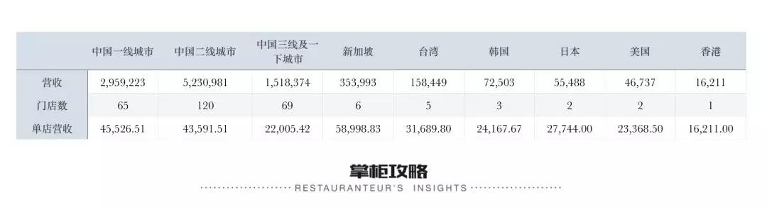 跟据招股书披露的按地区划分的餐厅营收数据,和相匹配的餐厅数量,我们不难发现,新加坡地区的海底捞单店营收能力最强,平均每家店年收入近五千九百万,远高于内地市场的一线和二线城市,而台湾和韩国、日本、美国等市场的单店年营收也高于内地三线及一下市场。