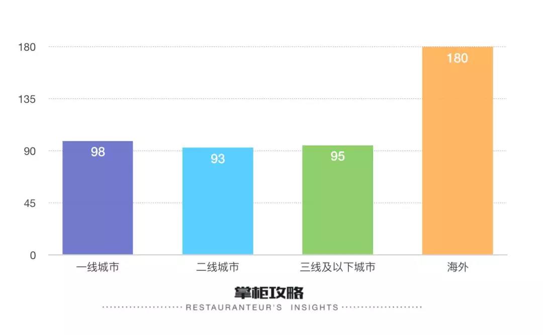 中国本土的客单价几乎没有受到城市发展水平的影响,一线城市的消费水平略高,人均消费 98.3 元,而三线及以下城市的消费水平居然略高于二线,想必海里捞下沉二三线城市的战略部署也是由此而来的;海底捞海外市场的客单价则远远甩开内地市场,人均消费 179.6 元,几乎是内地市场客单价的两倍。