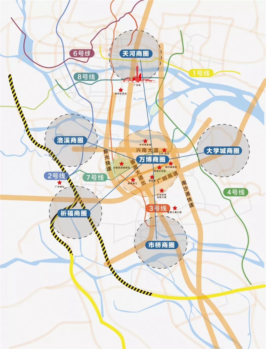 在政策、交通、客流等利好下,拥有“天时地利人和”的万博商务区,已齐聚万达、奥园、广晟、粤海、四海、凯德等8大发展商及9大明星项目,做好了对标天河路商圈,成为广州下一个城市级商圈的准备。