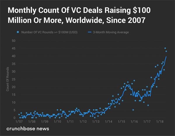 (2007年以来全球风投超过1亿美元的案例数量,来源:crunch base)