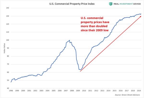 在美联储的“大水漫灌”下,能叫的上名字的资产全部“鸡犬升天”,商业地产更是如此,自2009年低点以来累计上涨已经超过111%。许多人或许并不知道2004-2008年期间,美国的商业地产和住宅一样经历了泡沫积累到破裂的时期,累计上涨了66%并在危机中跌去40%的价值。