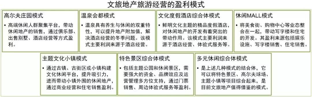 国内文旅地产的盈利来源可归纳为两大板块:一是地产销售;二是旅游经营。地产销售是依附在旅游经营上面的,旅游经营聚拢人气、带动地产销售,卖房可以快速回笼资金,然后再投入到文旅项目的开发中。地产业务的利润率高,但间接的价值创造核心还是旅游业务,优秀的文旅项目都具有鲜明的文化特色、独有的产业、服务等,能够很好地带动配套住宅的销售。