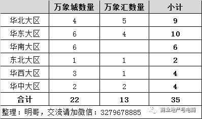 已开业购物中心35个(不含轻资产),包括22个万象城和13个万象汇,商业面积合计494.5万平米。华润实行大区管理模式,35个购物中心分布在华北、华东、华南、东北、华西和华中6个大区。