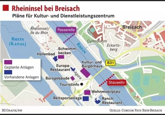 此项目的建设费用预计为890万欧元。其中,250万将由来自欧盟跨地区项目资助,该资助申请将于今年6月由相关委员会进行评审,最终结果预计将于12月确定。一旦申请被批准,该项目将马上动工。布莱萨赫市将资助67.5万欧元,由此也将获得在该建筑内举办本市活动的权利。其余费用将由法方支付。每年的运用费用预计为45.2万欧元。布莱萨赫市将承担其中的5万欧元,阿尔萨斯城镇承担23.3万欧元。中心外部还将有新的建设项目:露天广场西侧办公楼、现有室内泳池旁新建露天游泳池、在贯穿岛屿的主干道南侧修建房车停车场以及酒店。从长期角度来看,还将在莱茵河上修建步行桥,实现从布莱萨赫市中心直通岛屿。