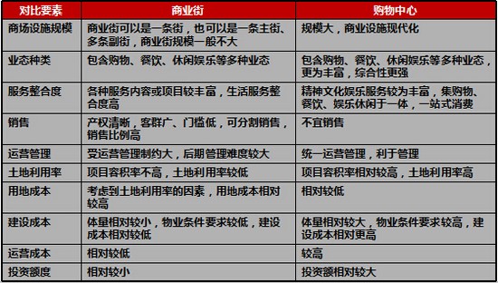 商业地产的产品形态形式多样,主要包括购物中心、大卖场、商业街、主题商场、城市综合体、专业市场等,仅以购物中心为例与文化商业街做简单对比: