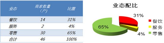 永新坊业态配比中零售和餐饮占到很大的比重,零售主要为服装零售,餐饮为特色餐饮。
