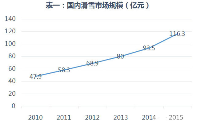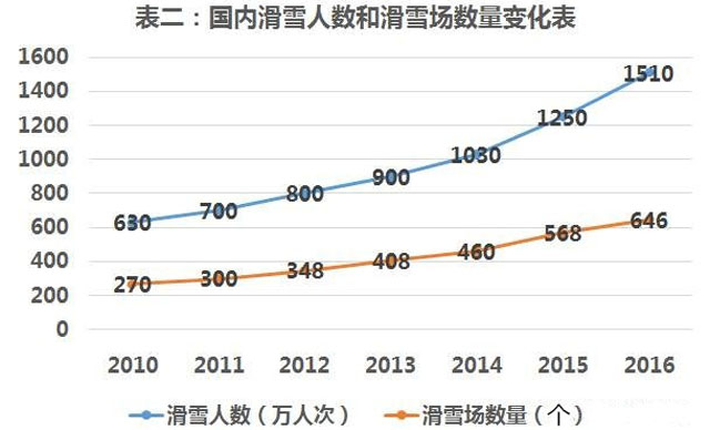 我国雪上产业正在高速发展,2015年市场规模已达116亿元人民币,如表一所示,增长速度在逐步加快,预计到2020年雪上产业市场规模将达到300亿元,如表二所示,滑雪总人数和滑雪场数量也在加速增长,人数增幅更是高于滑雪场数量增幅。