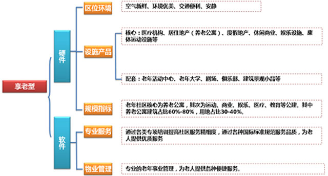 享老型主要面对老年群体,不同于以往的养老模式,要从物质和精神两个层面,通过舒适愉悦的生活环境、人性化的专业侍候体系、智能化的专控服务体系、便利性的特色产品体系保证老年人的身体健康,通过良好的人际交往环境、多元的休闲娱乐项目设置,使老年人获得心理上的享受。其开发架构如下: