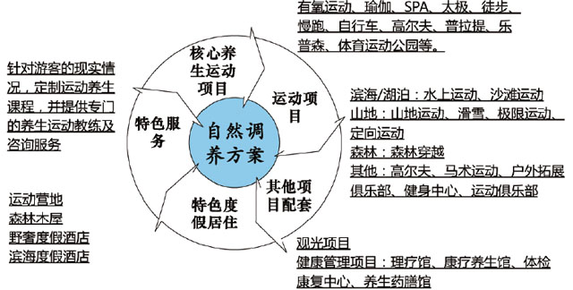 借助一定的地势及资源、气候条件,重点打造运动设施、场所,为游客提供强身健体、放松身心的独特体验,通过身体的释放,达到身心的愉悦。与普通的运动休闲不同,康体运动要求实现健康管理、运动休闲和旅游度假的融合,因此,诸如运用先进的设备和视频分析技术对游客的运动表现进行分析,在专家指导下进行调整等健康服务,显得尤为重要。这一开发形式,需要一些特殊的自然条件,比如山地、滨海、森林、冰雪等。其开发架构如下: