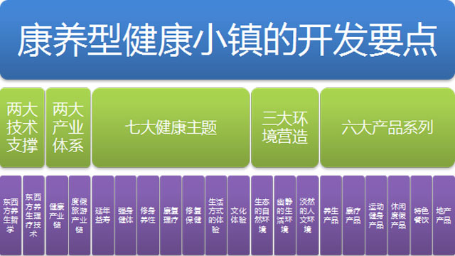 大健康特色小镇,是大健康资源与休闲度假旅游相结合的产物,发展的关键在于依托优势环境,以旅游产业为龙头,通过旅游的搬运功能,根据旅游者、居民的消费需求,将大健康产业业态聚集与整合,打造康养服务吸引力,形成与健康相关的常住居民和旅游人口的养生度假居住等大量消费的聚集,通过完善城镇配套,构建产业园区、养生度假区、消费产业聚集区、城镇化发展区,带动本地就业,进一步推动旅游与大健康产业的融合发展,促进城镇化发展。