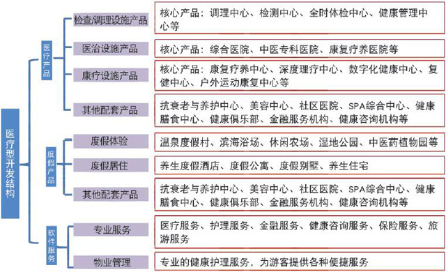 依托一定的气候及生态环境资源,重点开发或引进先进的医学设备设施及项目,形成能够满足疾病患者医疗前的检查、医疗中的治疗、医疗后的康复等全方位需求的产品体系。这一开发形式的特点在于,对医疗条件、医疗技术、医疗专业人员、医疗服务的要求较高,另外还需将医疗与度假结合起来,为医患人员提供相对安静、生态、健康的度假方式,并提供较长时间居住的便利条件。生态环境良好、交通条件便利、距城市较近的区域适合这一开发形式。其开发结构如下:
