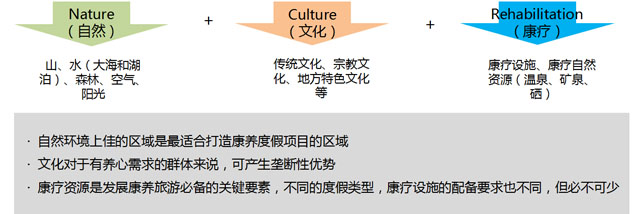 大健康产业恰恰从这三个方面入手,是维护健康、修复健康、促进健康的产品生产、服务提供及信息传播等活动的总和。随着我国“健康中国”战略的推进实施及康养旅游的推进,自然文化、康疗等大健康资源也成为度假旅游要素中不可或缺的一环,度假旅游要考虑对大健康资源的合理使用与整合。