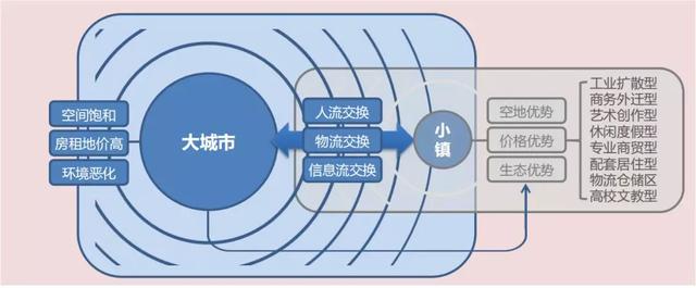 该类型小镇位于大城市辐射区,能与城市互动互补、相辅相成并承担一定城市功能,主动吸引城市要素扩散,形成交换。