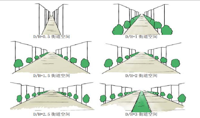 街道是康养小镇商业业态和休闲业态的聚集区,选址一般在康养小镇的出入口附近或大型集散广场附近,能够引起游玩者的注意,交通方便且有核心产业的产业特色。街道尺度较一般生活性街道尺度大,街巷空间的d/h多数在1左右时,是较为适宜的比例尺度。