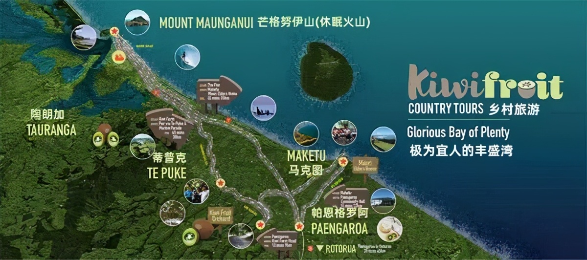 蒂普基(tepuke),这个曾以乳业为主的沿海小镇,随着奇异果(猕猴桃)产业的引入、发展,不仅迎来小镇经济发展“第二春”,更逐渐形成区域品牌、国家特色,甚至成为享誉全球著名的旅游观光小镇。而这个蜕变过程,主要得益于: