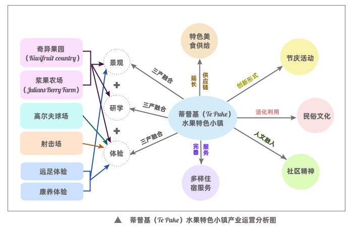 蒂普基(tepuke)特色小镇,以猕猴桃种植业为基础,融合加工业、旅游业及休闲度假产业,形成“1 2 3”产业联动发展。