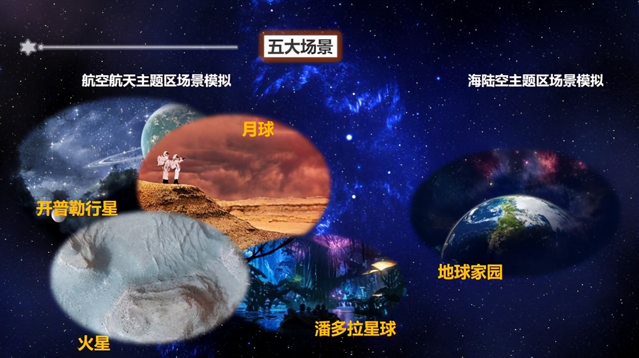 规划航空航天主题区和海陆空主题区及五大虚拟场景。