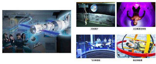 开设月球漫步、太空舱漂浮体验、飞行体验馆、航天训练器等。创造在地面条件下模拟宇航员在月球表面行走的环境和太空舱失重环境,人们可以体验克服地球引力、双脚离地、自由飞行。