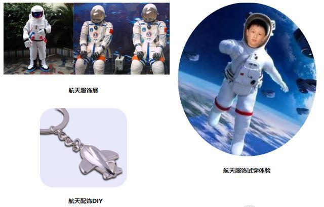 针对航天服饰,展示不同时期、不同类型的的航天服装,并提供试穿体验。另外可根据太空服上必须的装备,diy手袋、钱包以及各种配饰等。