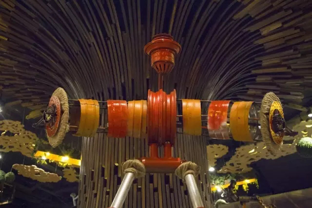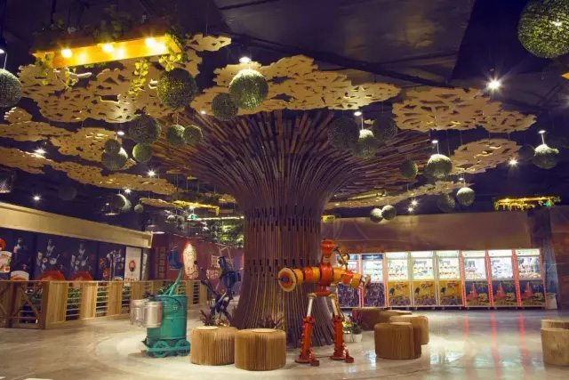 这颗树上的每一块木头都有自身的编码,木头效果经过数道无公害的防腐木处理程序,叶子采用的都是生态麦秆压塑材料,叶子上方模仿太阳天然光线加予泛射灯等等,处处体现了整个设计构思的精益求精。