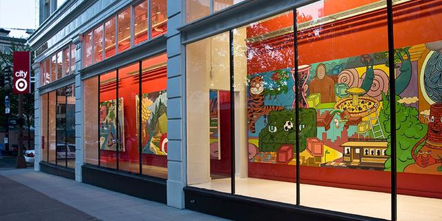 为了更新品牌形象、支持社区和当地艺术家,美国百货 target 在伯灵顿、佛蒙特、圣地亚哥、加利福尼亚等地寻找本地艺术家并与之合作,创作室内画、橱窗展览画等。