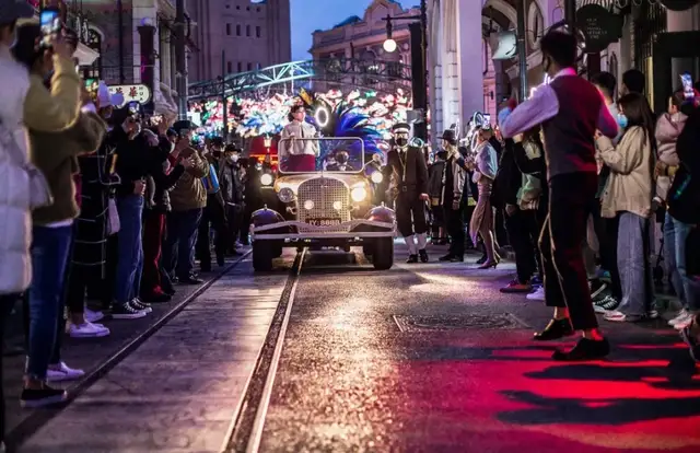 白天应接不暇的行进式及沉浸式演艺分布园区各处,好评如潮。一到夜幕降临华灯初上,闯入夜间演艺《一路有戏》,200余名演员参演,70分钟剧情,涵盖三重时空、四幕好戏、八大场景,感受夜场的繁华,成为剧中主角。