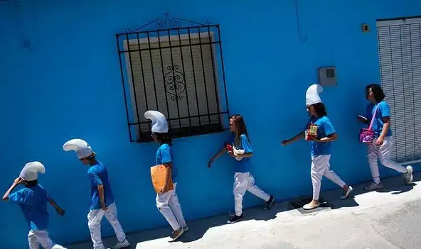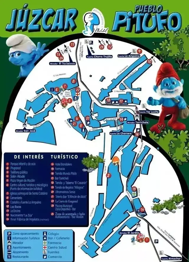 对于安达卢西亚人,艺术渗透在他们每个细胞之中,随手几笔就能勾勒出可爱的图案。所以,本地居民也参与到了“美化家园”的活动中,他们在蓝色的墙壁上创作了一系列蓝精灵壁画,营造出蓝精灵们仿佛真的生活在这里的氛围,而且给游客提供“摆拍”留影的空间。