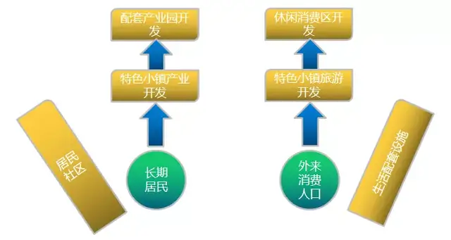 所有类型的小镇核心都在于人口的聚集。以长期居民和外来消费人口两条基本逻辑来进行特色小镇开发,特色小镇开发一般都包含六个部分: