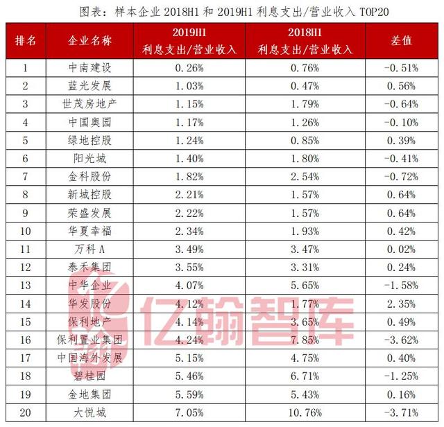 位于首位的中南建设,2019年上半年利息支出0.6亿元,较2018年同期减半。同时,营业收入233.2亿元,较2018年同期增长52.3%。此类规模相对较小,盈利能力提升较快的房企利息支出/营业收入的比值相对较小。