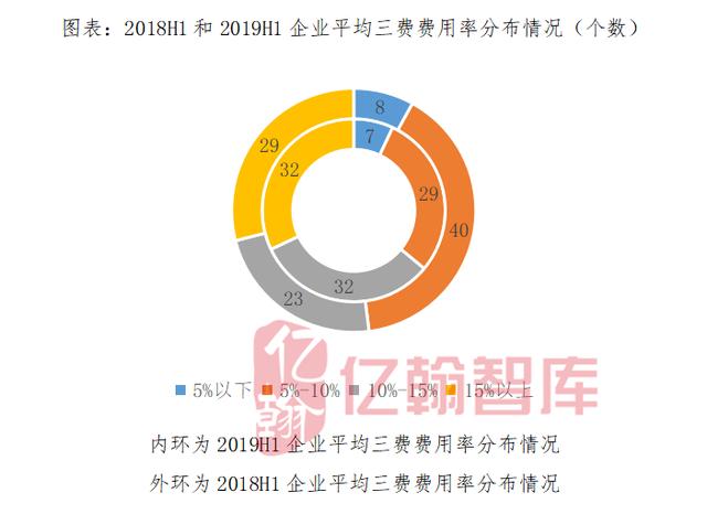 2019年上半年,top100房企的平均三费费用率为13.8%,较2018年同期上升0.4个百分点。三费费用率在5%以下的企业占7%,较2018年同期下降1个百分点。三费费用率在5%和10%之间的企业占29%,较2018年同期下降11个百分点。三费费用率在10%和15%之间的企业占32%,较2018年同期上升9个百分点。三费费用率在15%以上的企业占32%,较2018年同期上升3个百分点。