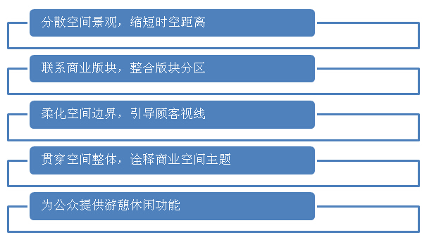 线性景观的带状特性使得商业空间中,人与景观有了更大的接触面积,人们可以更方便的参与到景观中。因此从景观设计的人性化角度出发,考虑到人性的需求,线性景观的游憩休闲功能无疑为顾客提供了很大的方便。通过与各商业空间的有机结合,形成一个活动、交流、休闲的开放式空间,极大程度的增大了商业空间的服务区域。因此,线性景观根据其所处区域,同时也为商业空间承担着部分的商业功能。如下图: