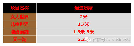 对于这种中低端的商场来说,通道宽度一般在1.5米—2米之间,某些地方通道可以宽一些,但控制在3米之内,避免面积的浪费。