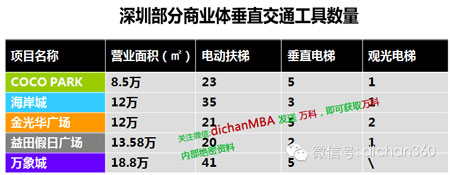 由于商业体倾向于让顾客乘坐电动扶梯和观光电梯,所以电动扶梯和观光电梯一般设置在最显眼的地方——中庭的附近。而普通垂直电梯则设置得比较隐晦,顾客一般要根据导视牌才能找到。