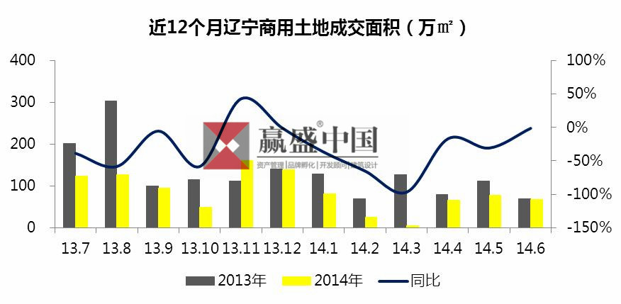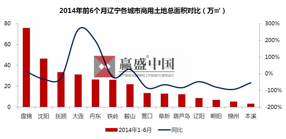 2014年上半年,沈阳的商用土地成交面积超其他三个典型城市,成交面积达46.3万平方米,位居第一。大连成交面积总面积31万平方米,位居第二;与去年同期相比,大连增幅最大,同比增长265%。