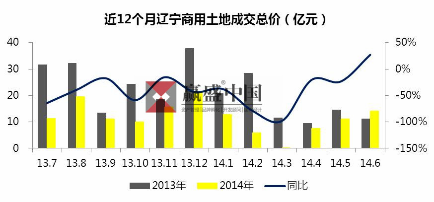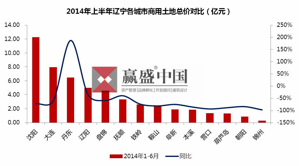 2014年上半年,辽宁各城市,除丹东商用土地成交总价高于去年同期外,其余各城市均出现不同程度地低于去年同期。