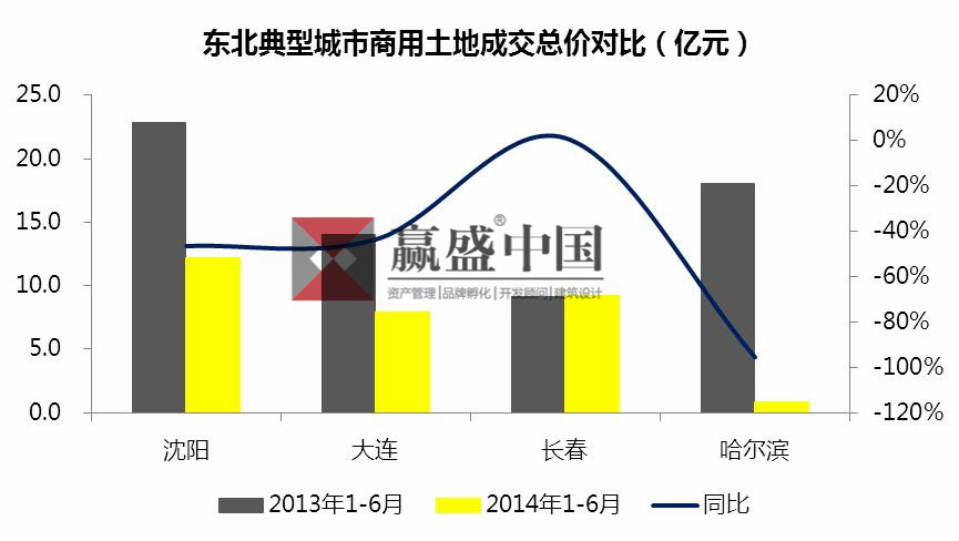 2014年上半年,沈阳的商用土地成交总价远高于其他三个城市,为12.23亿元,位居第一;长春成交总价为9.2亿元,位居第二;大连商用土地成交总价为7.9亿,哈尔滨商用土地成交总价为8000万元。