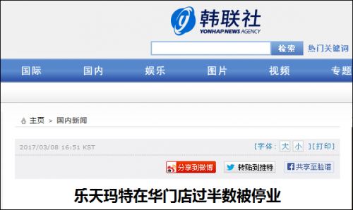 据韩联社3月8日最新消息,截至当天下午4时,在中国境内停业的乐天玛特门店数量已达55家,3月7日仅仅只有39家。韩联社称乐天玛特在中国的门店总数为99家,这就意味着超过半数的门店已经停业。