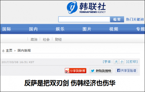 韩联社称,韩国的专家们普遍认为中国反对萨德和限韩令将会激起韩国的民族情绪,直接损害包括旅游行业在内的一系列中国企业的利益。韩国仁荷大学国际贸易系郑承衍教授8日指出,中国报复“萨德”将使韩国人感到国防安全受到威胁,很可能催生年轻一代消费者对中国制造的抵制行动。