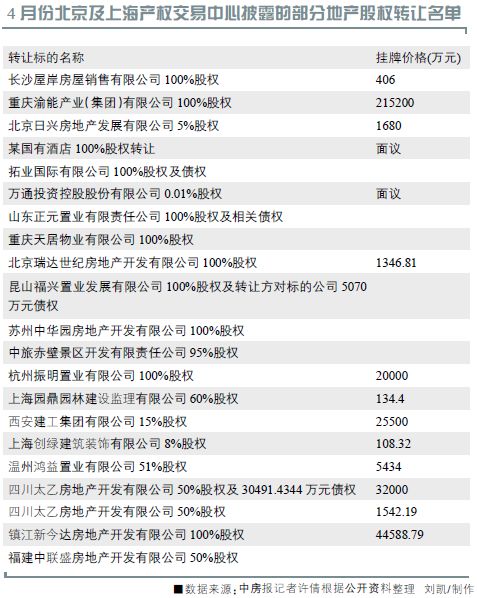 更多中小型房企则被洗牌出局,不得不加快甩卖自身资产,以期卖个好价钱。中国房地产报记者根据北京、上海产权交易所披露信息,4月份以来,新增20多家房企挂牌转让股权,所涉及项目无不处于亏损或高负债状态。粗略统计,挂牌价超过35亿元,其中近一半房企并未标注转让价。标注的挂牌价中,股权价仅占极小部分,大多数金额来自债权,即被转让房企需支付的负债及利息。