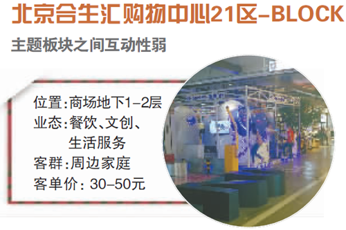 涵盖多功能街区的合生汇21区-block位于合生汇b1和b2层,总面积约5000平方米。与其他街区不同的是,该街区并没有一个鲜明的主题,涵盖了餐饮、文创和生活服务业态三大板块。同时将一个街区分为了八大主题街区,如兔子市集、日不落公园、吃货研究所等。北京商报记者走访看到,消费客群以“80后”、“90后”为主,这也与合生汇周边拥有多个中高档住宅小区分不开。在这些主题街区中,餐饮街区相对较受欢迎,周六下午五六点左右,有大量的食客在等位排号。相比之下,饰品、手工等区域客流较少,八大小街区之间缺少一些关联性,客流分布不均。