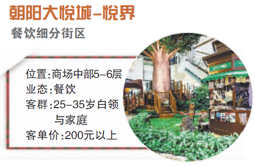 “悦界”主打下午茶和主题餐厅。据介绍,悦界将两层区域联通,整体约1万平方米,其中一半空间用于中心花园、水系及街景等公共环境的打造。5层强调慢生活主题,多为一些特色的下午茶店,还有一些创意零售店铺作为补充。6层为主题餐饮区,例如j大侠、撒娇、小确幸和大渔等网红餐厅。5层与6层中间区域设有中庭挑空,形成通透的联体。朝阳大悦城位于朝青板块核心地段,该区域内以北京城市白领人群为主,朝阳大悦城相比西单大悦城的客群消费水平略高,同样身处朝阳大悦城之中的悦界客单价也比其他街区略高。