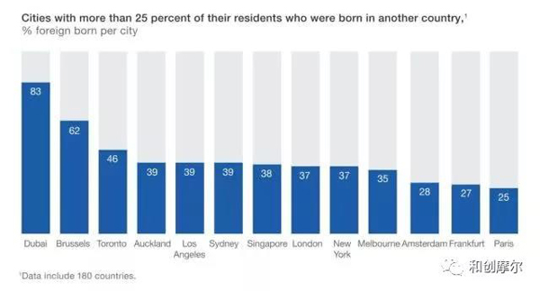 在过去二十年中,移民模糊了地理边界。比如,迪拜是目前世界上最国际化的城市:外国出生的居民占其人口的83%,居民来自200多个国家,讲140种不同的语言。